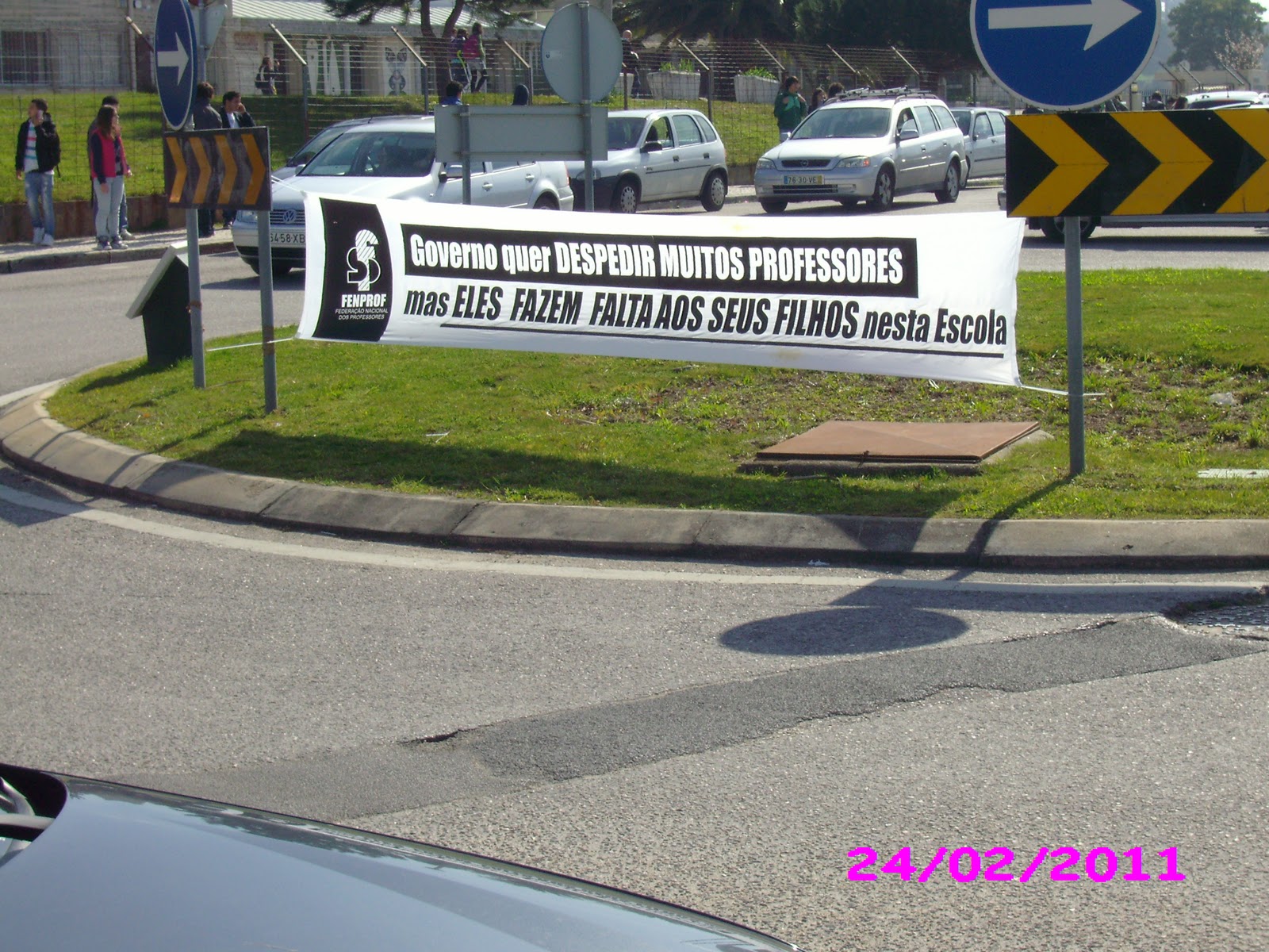Hoje, mal saí de casa, deparei-me com este pano na rotunda Drª. Cristina Torres, junto à Escola Secundária nº 3: "GOVERNO QUER DESPEDIR MUITOS PROFESSORES, mas eles fazem falta aos seus filhos nesta Escola."